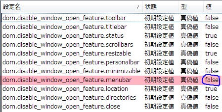 設定名「dom.disable_window_open_feature.menubar」のところの「false」をダブルクリックして「true」に変える。