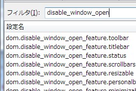「フィルタ」の欄に「disable_window_open」と入力する。